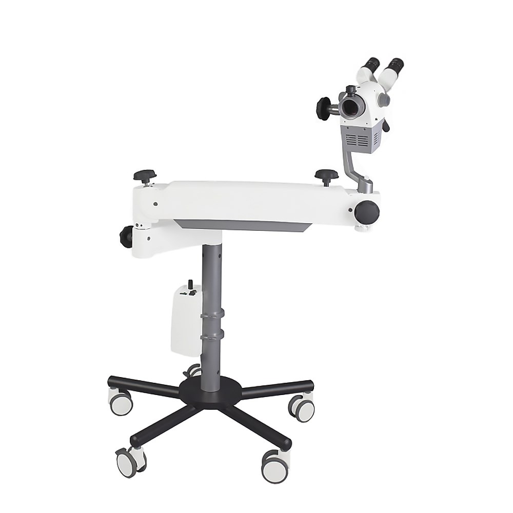 Консольный штатив для свободного позиционирования плеча и оптической головы в рабочей зоне. Возможность регулировки положения оптической головы и бинокулярный тубус 45° позволяют подстраиваться под любые виды манипуляций для комфортной работы врача. Мобильное пятилучевое основание. 5 колёс с системой фиксации для обеспечения более стабильного положения прибора при исследовании.